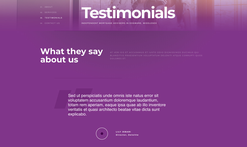 This template from our bronze service is noteworthy simple. It encompasses a bigger bold image on the homepage and a menu that reveals itself as you scroll. Key information is broken down and easy on the eye to prevent bounce rate and all pages can be navigated with ease. We’ll add your branding, logo and meet other design needs within this package.